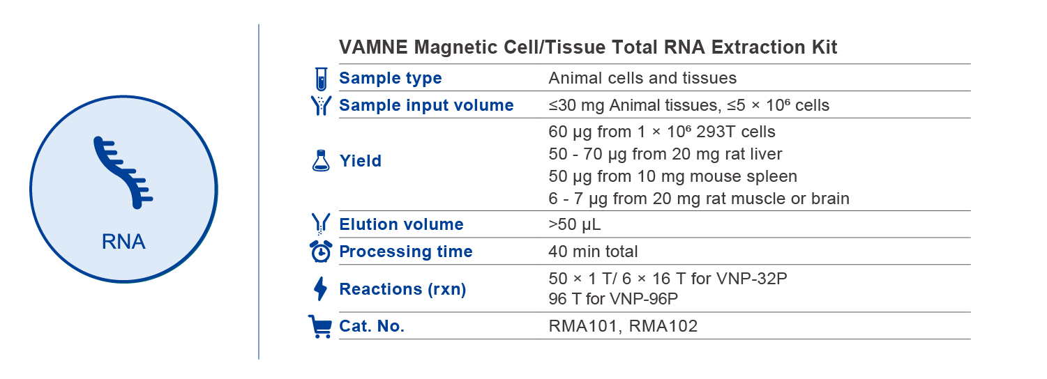 VAMNE Magnetic Cell/Tissue Total RNA Kits provide a fast, easy method for the preparation of total RNA from animal cells and tissues. Contaminants and inhibitors could be completely removed, leaving purified RNA ready for use in downstream applications, such as