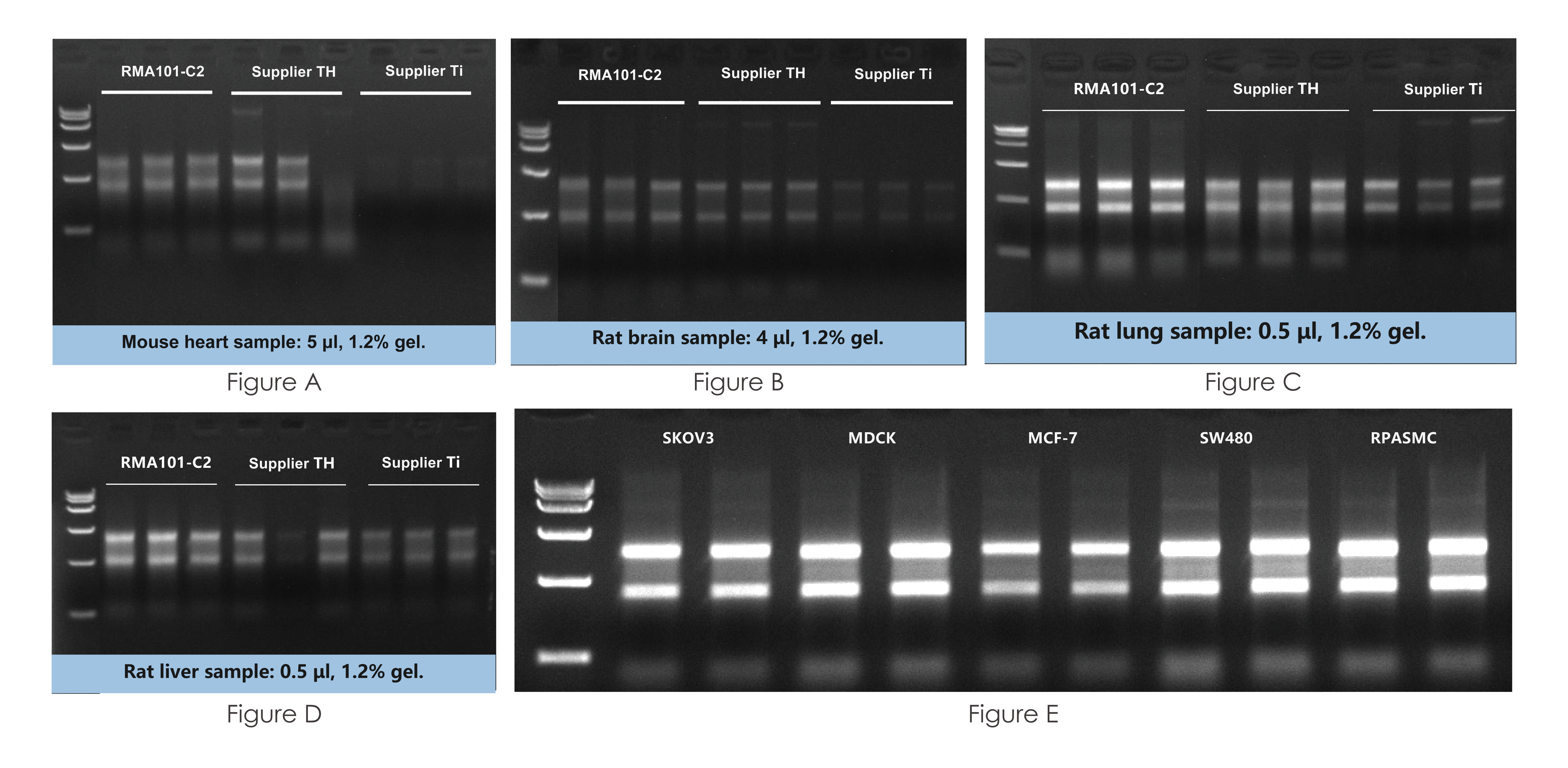 Vazyme RMA101-C2 and commercially available comparable products (Supplier TH and Supplier Ti) were used to extract total RNA from mouse heart, rat brain, rat lung, and rat liver samples according to the respective manuals (Figure A-D). RNA extracted and purified by RMA101-C2 was analyzed by agarose gel electrophoresis (Figure E).