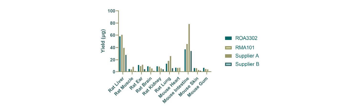 RMA101 consistently delivers superior total RNA yield across a wide range of tissues. Quantified by NanoDrop, our kits outperform competitor kits, providing RNA you can rely on for every downstream application.